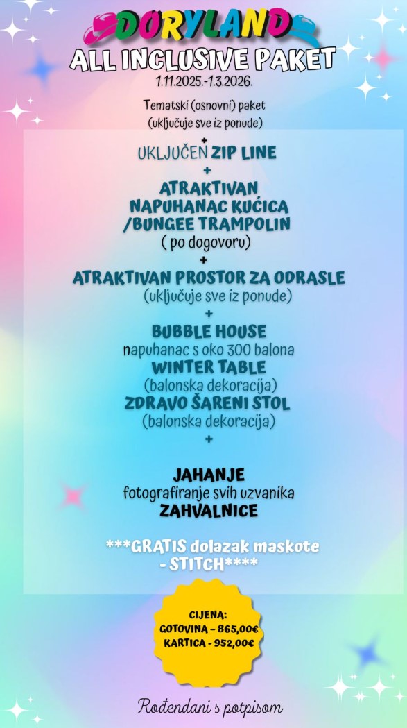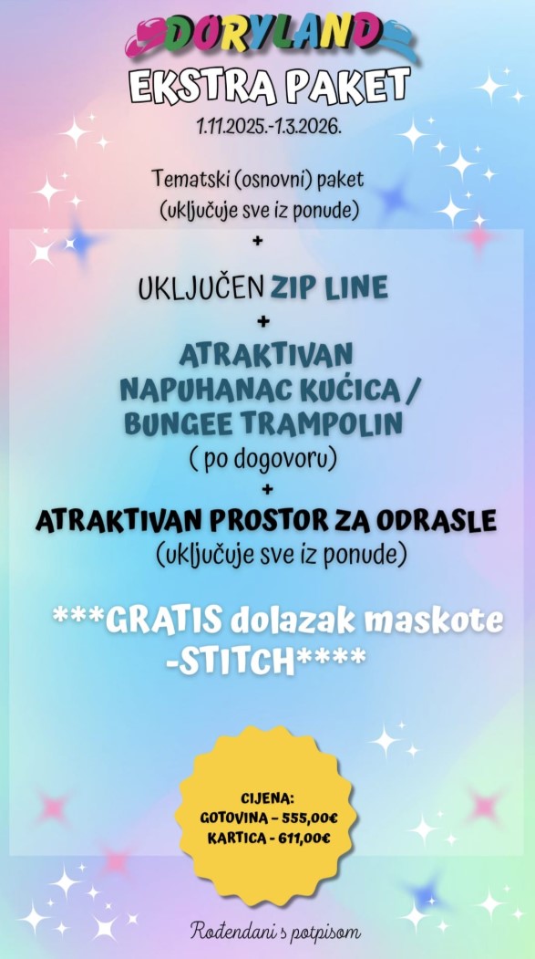 Naravno, Doryland organizira najčarobnije ročkase i onih najmanjih slavljenika od proslave 1.ročkasa.U takvoj organizaciji smo konkuretni jer pružamo nezaboravnu proslavu za cijelu obitelj, uključujući dobru zabavu za one najmlađe,uz odlične animatorice,dvorac napuhanac,trampoline,ljuljačke,maskote po izboru ali i odlične obiteljske fotografije koje ostaju trajne uspomene.